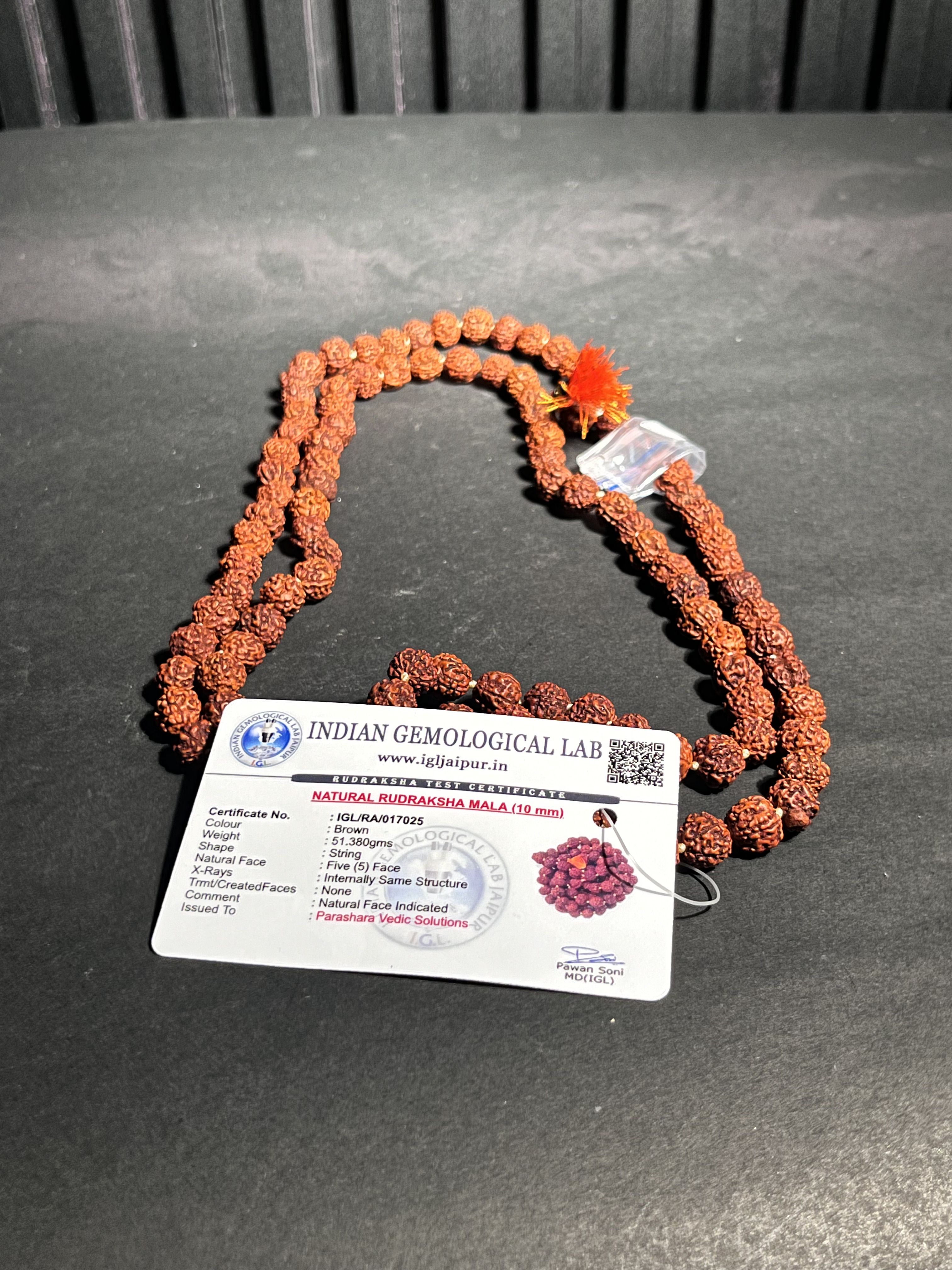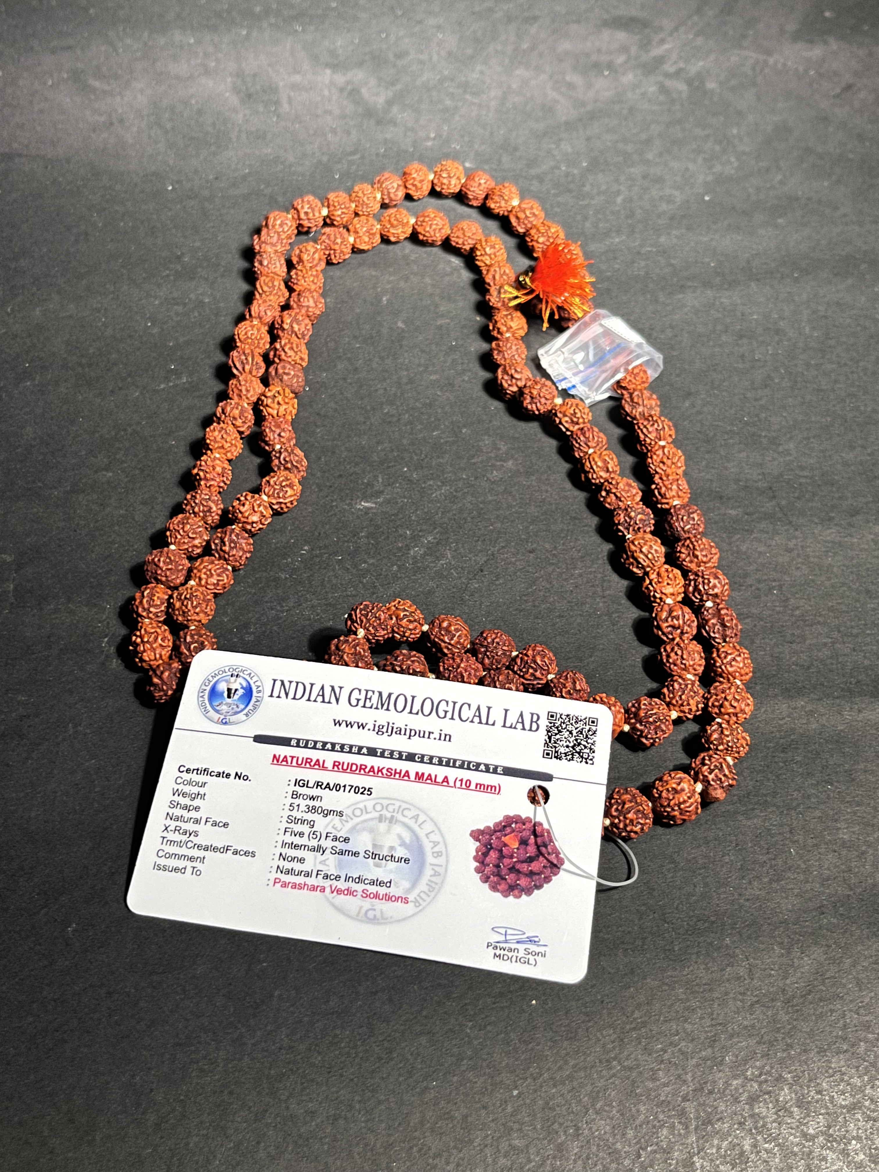 Certified natural 5 Mukhi Rudraksha Mala, 10mm beads, 51.38g, IGL authenticated. Sacred for meditation, japa, and spiritual wellness. Blessed by Parashara Vedic Solutions.